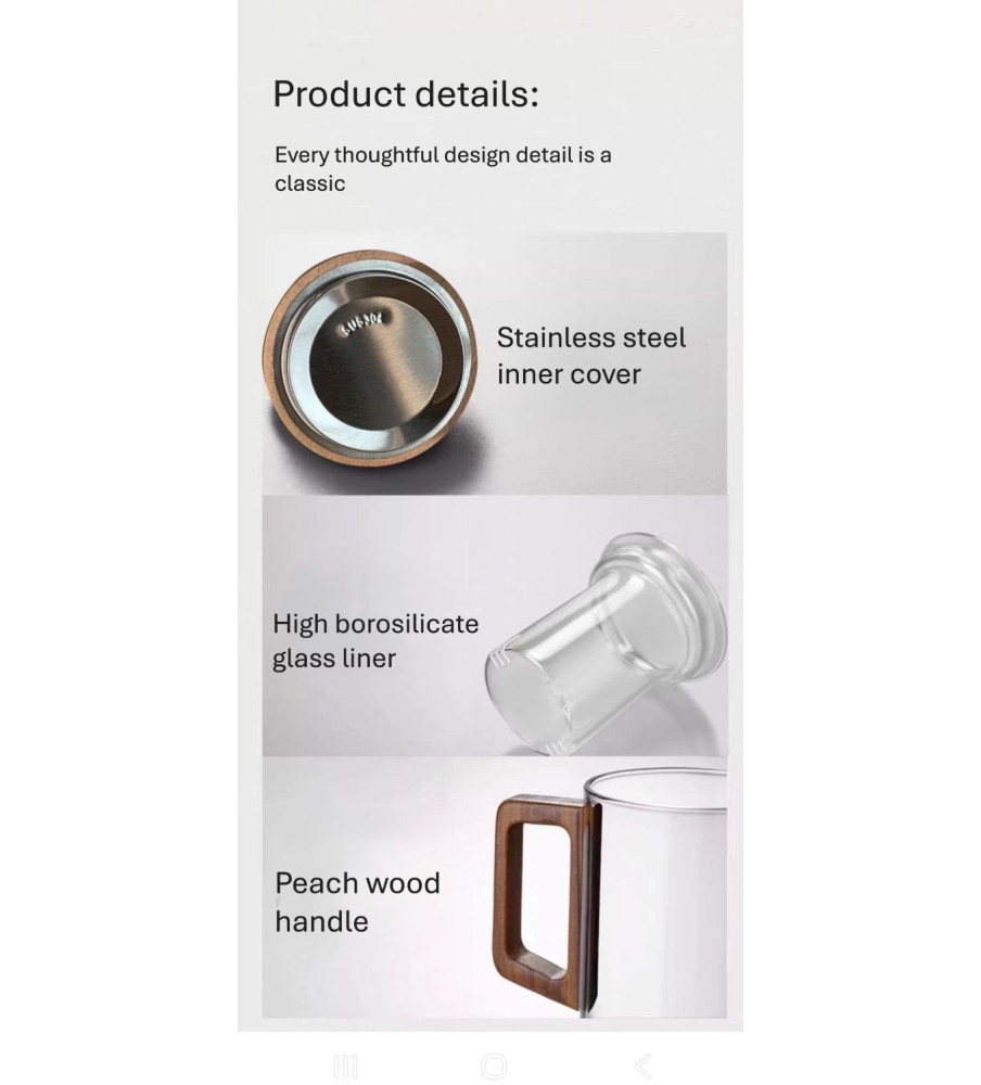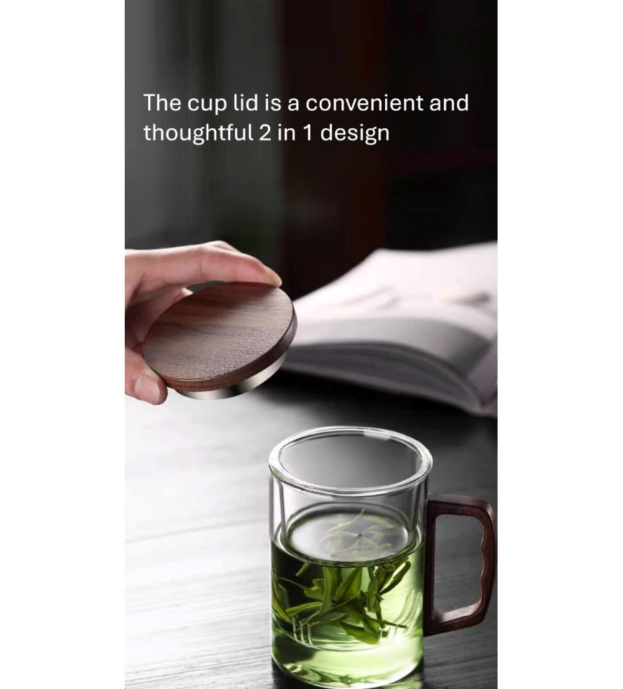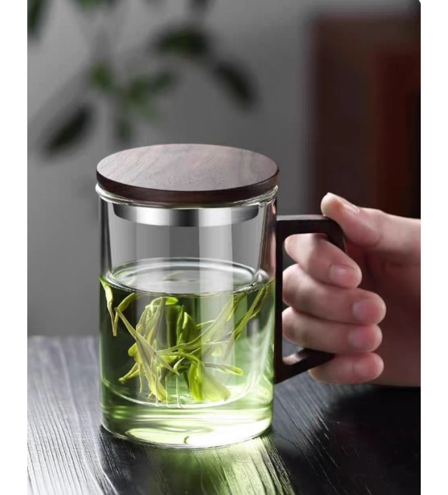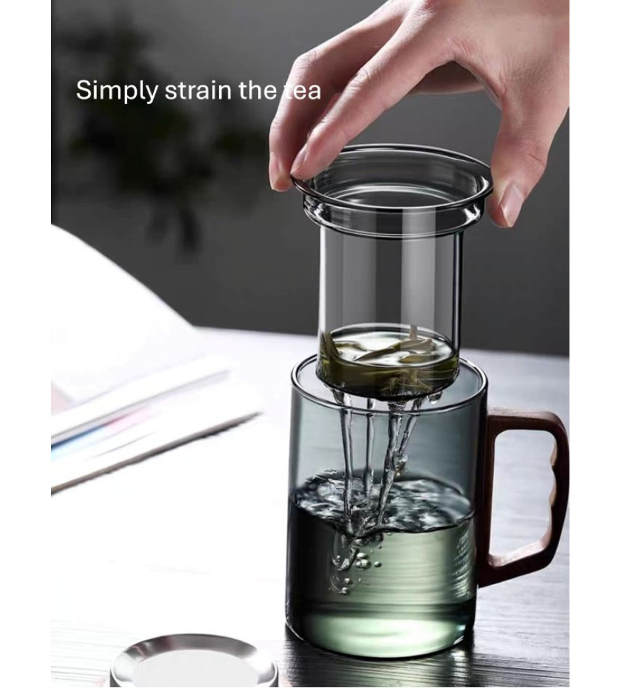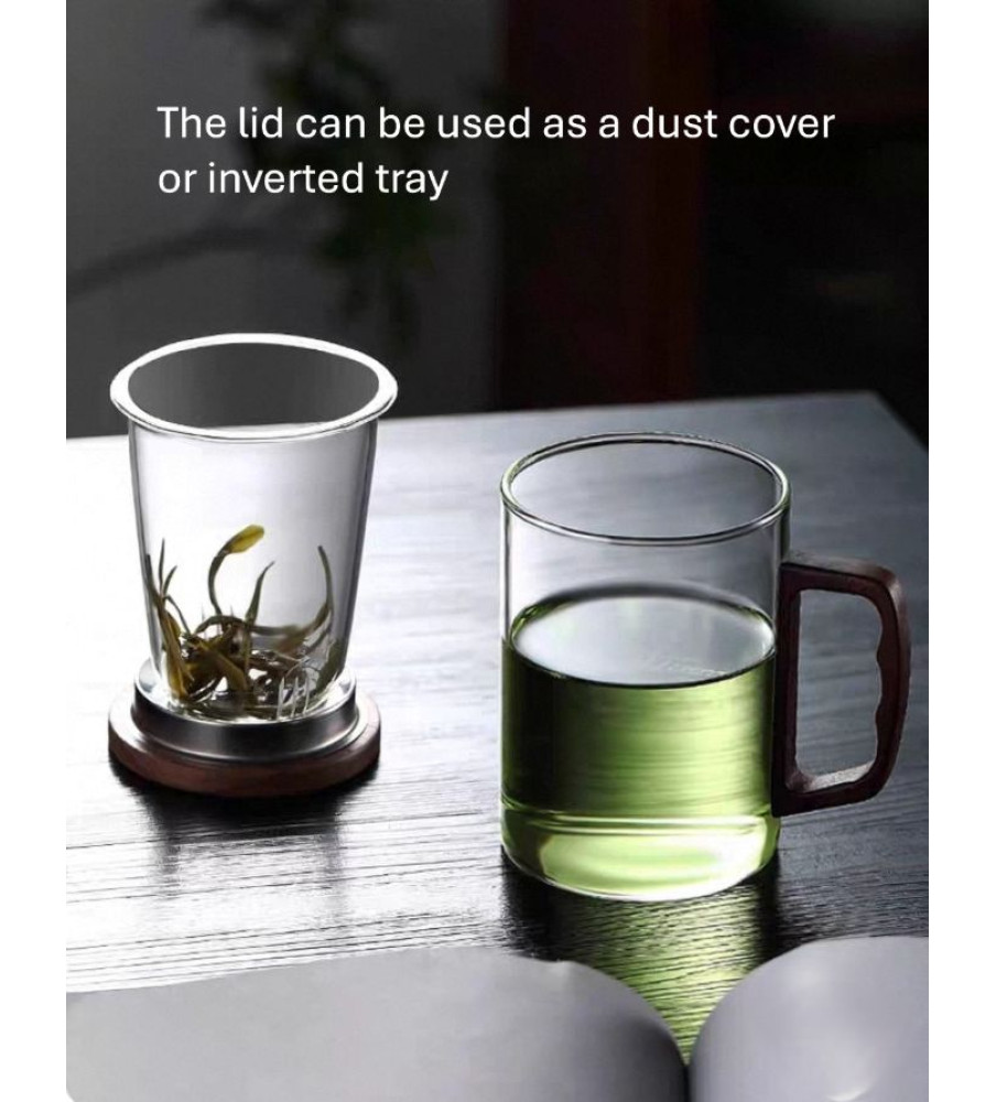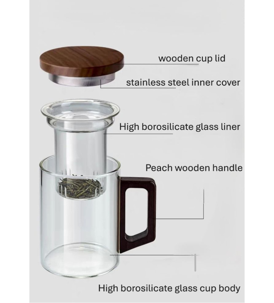 A heat-resistant borosilicate glass mug with glass strainer, natural wooden lid and handle, designed for safe brewing, easy separation, and comfortable, elegant daily tea enjoyment.